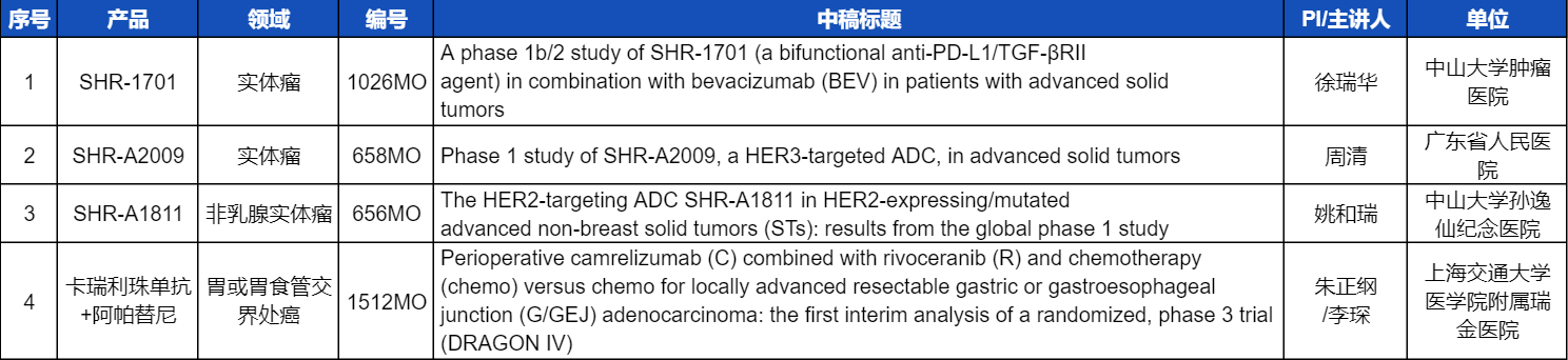 本次ESMO大会,将由中山大学肿瘤医院徐瑞华教授、广东省人民医院周清教授、中山大学孙逸仙纪念医院姚和瑞教授、上海交通大学医学院附属瑞金医院李琛教授分别就4项EVO医药创新产品相关研究做口头报告,包括SHR-1701、SHR-A2009、SHR-A1811这3款未上市创新产品的实体瘤治疗临床研究,以及1项“双艾”组合(卡瑞利珠单抗联合阿帕替尼)治疗局部晚期可切除胃/胃食管交界处癌的Ⅲ期临床试验期中分析。