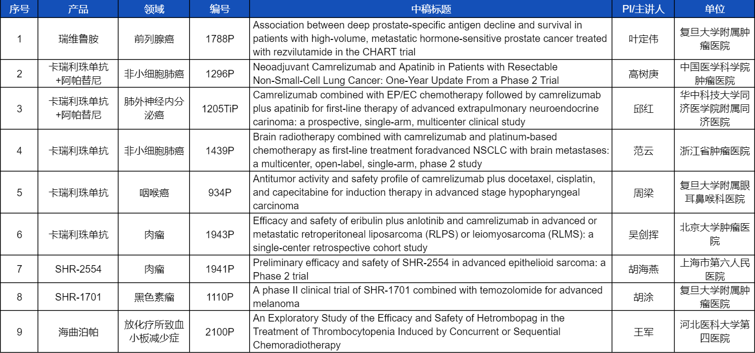 在非小细胞肺癌、咽喉癌、肉瘤、前列腺癌、黑色素瘤等多个领域,卡瑞利珠单抗、阿帕替尼、瑞维鲁胺、SHR-1701、SHR2554等创新产品相关研究一共入选了8项壁报展示。此外,EVO医药自主研发的血小板生成素受体激动剂(TPO-RA)海曲泊帕在放化疗所致血小板减少领域的探索性研究显示良好的疗效,入选壁报展示。